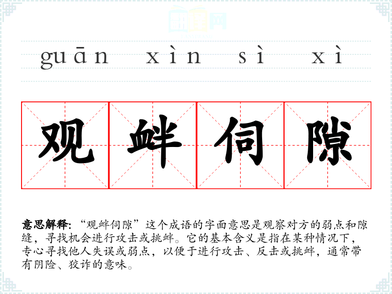 “观衅伺隙”这个成语的字面意思是观察对方的弱点和隙缝,寻找机会进行攻击或挑衅。它的基本含义是指在某种情况下,专心寻找他人失误或弱点,以便于进行攻击、反击或挑衅,通常带有阴险、狡诈的意味。