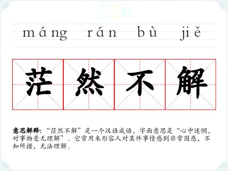 “茫然不解”是一个汉语成语,字面意思是“心中迷惘,对事物毫无理解”。它常用来形容人对某件事情感到非常困惑,不知所措,无法理解。