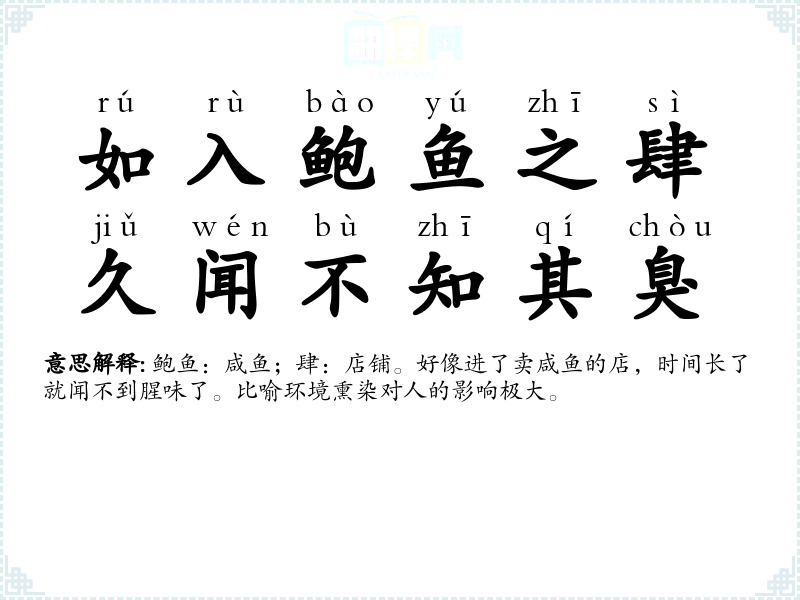 鲍鱼:咸鱼;肆:店铺。如同进入咸鱼店,时间一长就闻不到它的腥臭味。比喻环境对人的熏染和影响。 |
