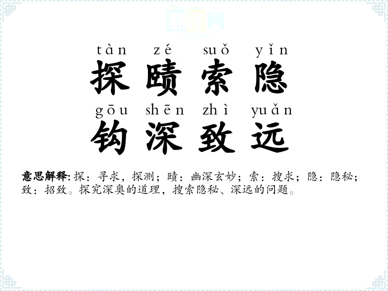 探:寻求,探测;赜:幽深玄妙;索:搜求;隐:隐秘;致:招致。探究深奥的道理,搜索隐秘、深远的问题。 |