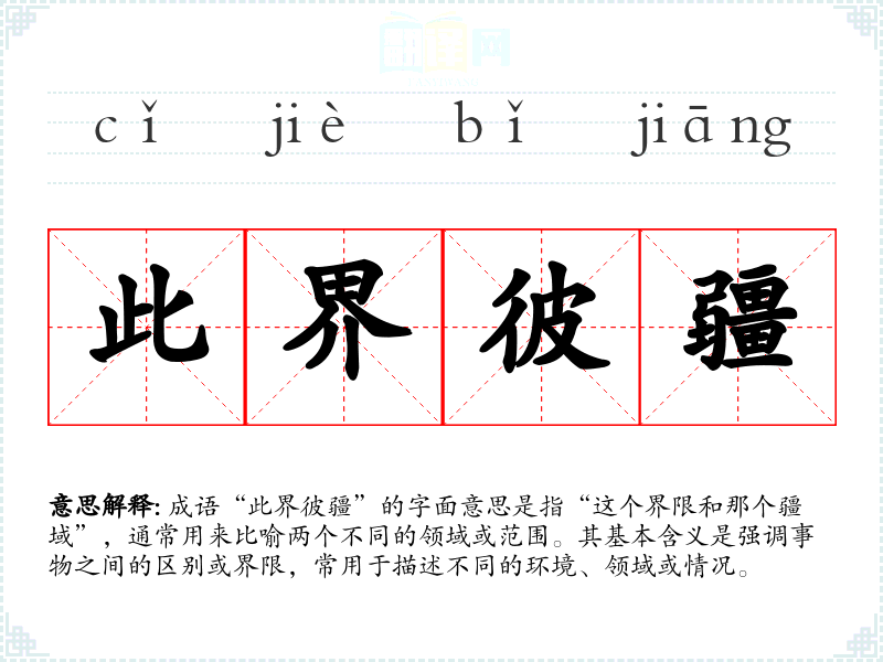 成语“此界彼疆”的字面意思是指“这个界限和那个疆域”,通常用来比喻两个不同的领域或范围。其基本含义是强调事物之间的区别或界限,常用于描述不同的环境、领域或情况。