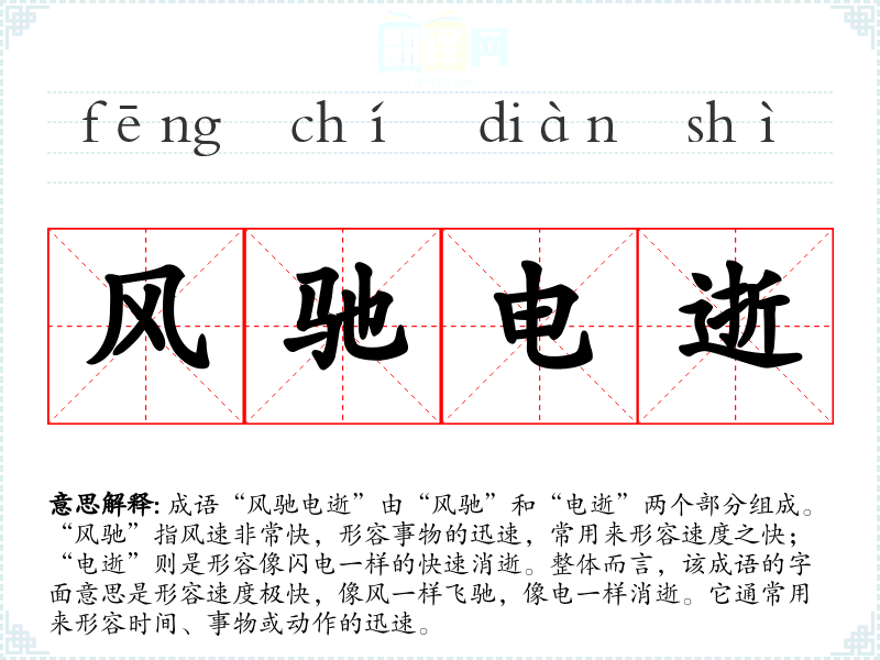 成语“风驰电逝”由“风驰”和“电逝”两个部分组成。“风驰”指风速非常快,形容事物的迅速,常用来形容速度之快;“电逝”则是形容像闪电一样的快速消逝。整体而言,该成语的字面意思是形容速度极快,像风一样飞驰,像电一样消逝。它通常用来形容时间、事物或动作的迅速。