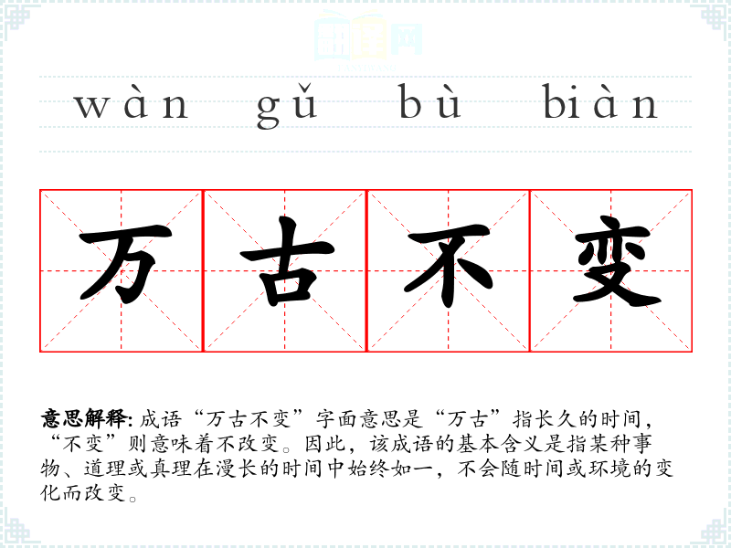 成语“万古不变”字面意思是“万古”指长久的时间,“不变”则意味着不改变。因此,该成语的基本含义是指某种事物、道理或真理在漫长的时间中始终如一,不会随时间或环境的变化而改变。