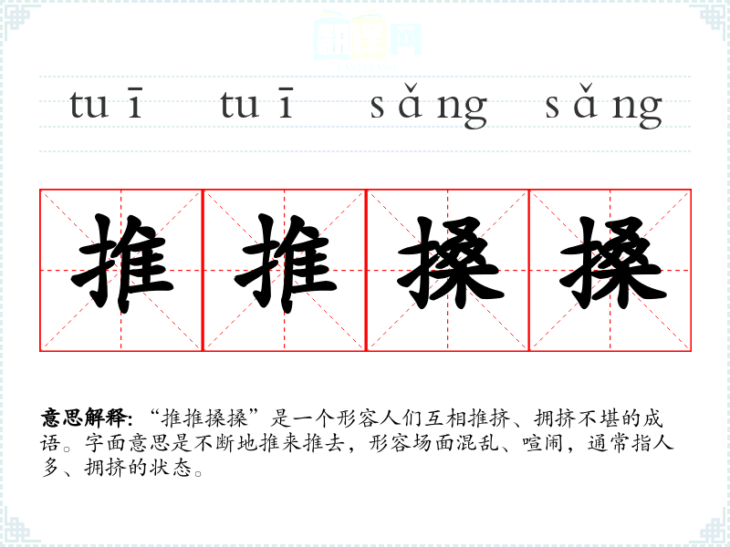 “推推搡搡”是一个形容人们互相推挤、拥挤不堪的成语。字面意思是不断地推来推去,形容场面混乱、喧闹,通常指人多、拥挤的状态。