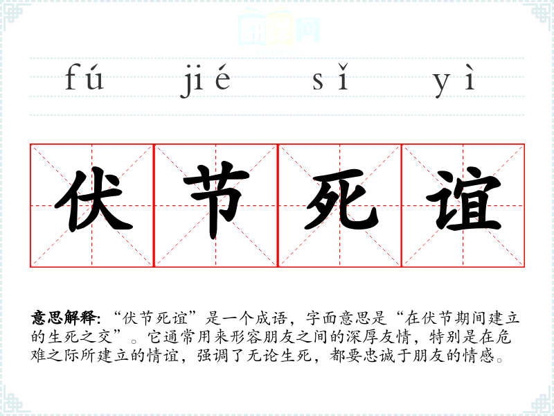 “伏节死谊”是一个成语,字面意思是“在伏节期间建立的生死之交”。它通常用来形容朋友之间的深厚友情,特别是在危难之际所建立的情谊,强调了无论生死,都要忠诚于朋友的情感。