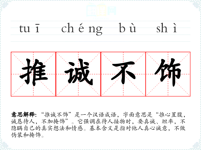 在英语中,“to be honest”或“speak from the heart”可视为与“推诚不饰”相对应的表达。这些短语同样强调了真诚和坦率在交流中的重要性,但在具体用法和文化背景上可能存在差异。