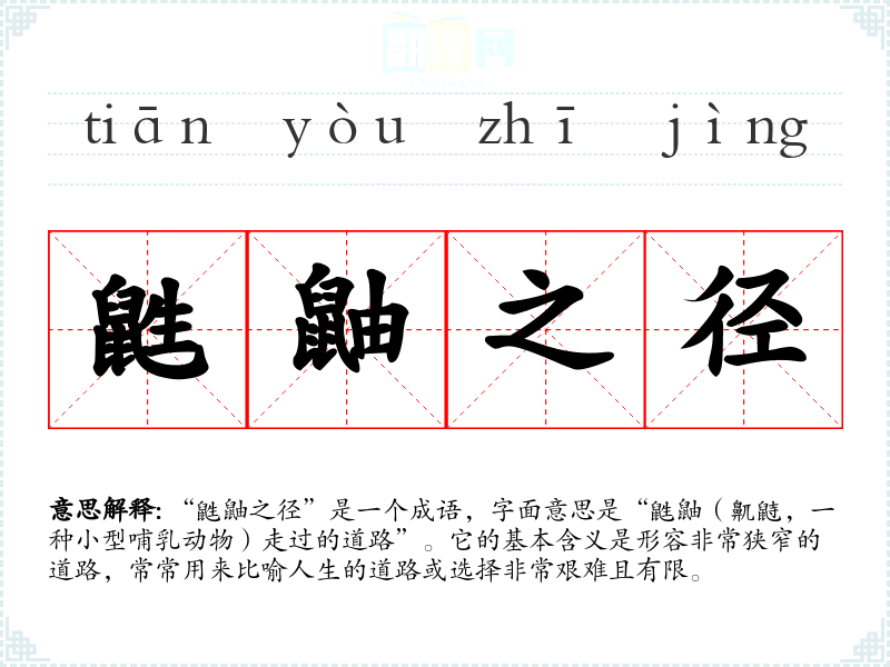 “鼪鼬之径”是一个成语,字面意思是“鼪鼬(鼿鼭,一种小型哺乳动物)走过的道路”。它的基本含义是形容非常狭窄的道路,常常用来比喻人生的道路或选择非常艰难且有限。