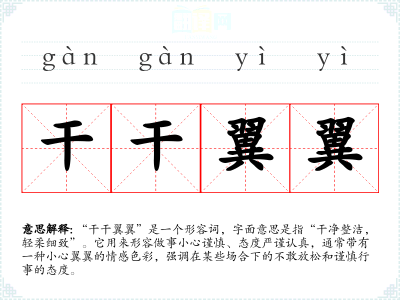 “干干翼翼”是一个形容词,字面意思是指“干净整洁,轻柔细致”。它用来形容做事小心谨慎、态度严谨认真,通常带有一种小心翼翼的情感色彩,强调在某些场合下的不敢放松和谨慎行事的态度。
