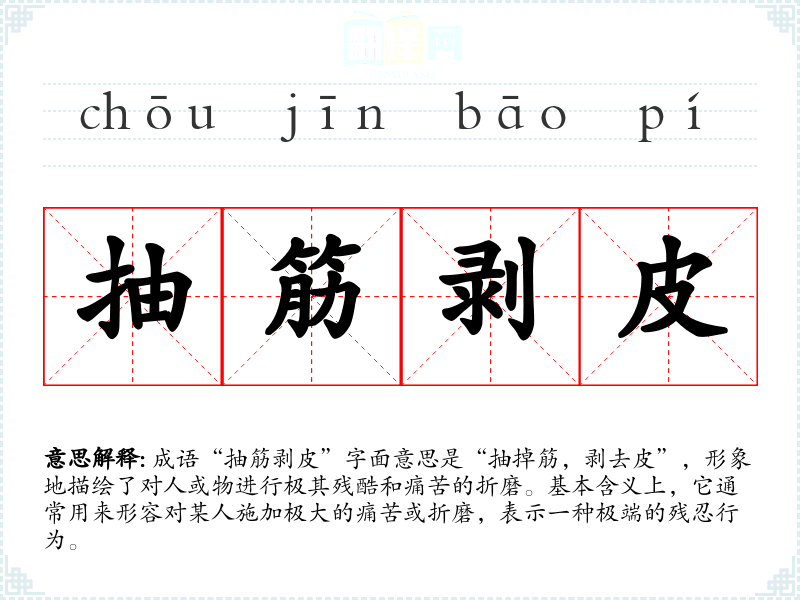 成语“抽筋剥皮”字面意思是“抽掉筋,剥去皮”,形象地描绘了对人或物进行极其残酷和痛苦的折磨。基本含义上,它通常用来形容对某人施加极大的痛苦或折磨,表示一种极端的残忍行为。