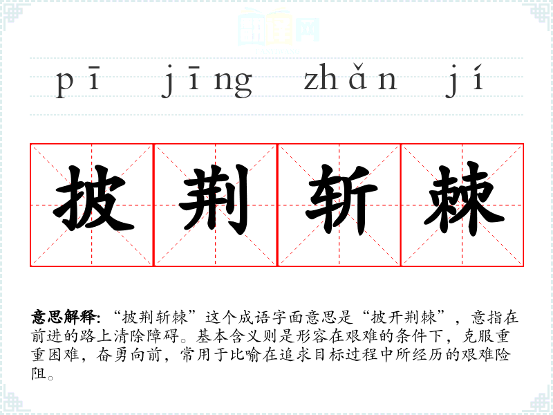 | 披荆斩棘 | 劈开丛生多刺的野生植物。比喻在创业过程中或前进道路上清除障碍,克服重重困难。 |