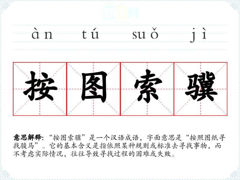 “按图索骥”是一个汉语成语,字面意思是“按照图纸寻找骏马”。它的基本含义是指依照某种规则或标准去寻找事物,而不考虑实际情况,往往导致寻找过程的困难或失败。