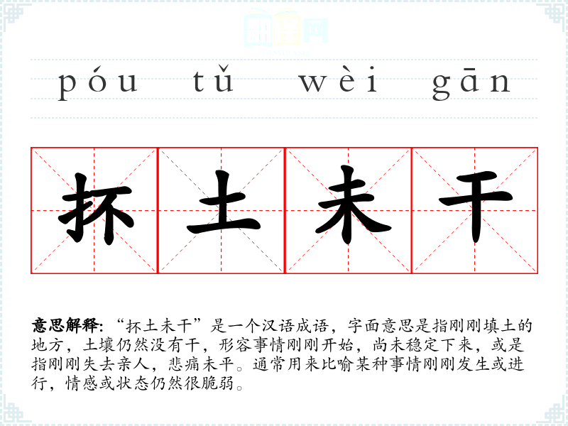 “抔土未干”是一个汉语成语,字面意思是指刚刚填土的地方,土壤仍然没有干,形容事情刚刚开始,尚未稳定下来,或是指刚刚失去亲人,悲痛未平。通常用来比喻某种事情刚刚发生或进行,情感或状态仍然很脆弱。