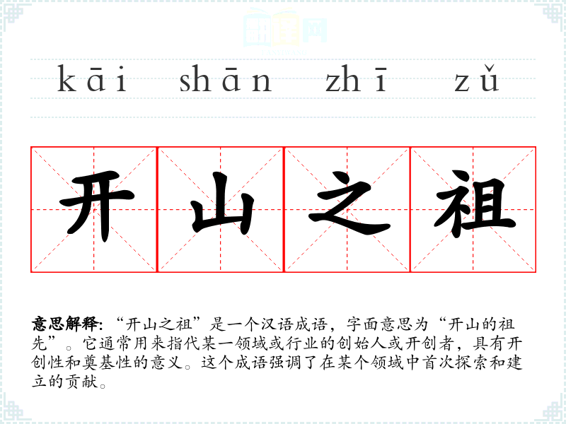 在英语中,类似的表达可能是“pioneer”或“founding father”,这些词汇同样用于形容某一领域的开创者。不过,中文的“开山之祖”更强调“开山”这一具有具体行为的形象,传达出一种开创与探索的实际动态。