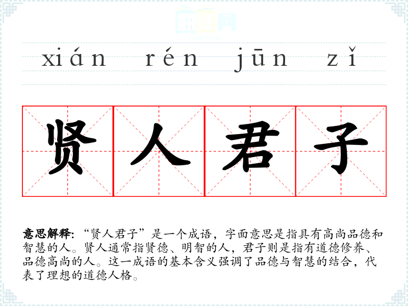 “贤人君子”是一个成语,字面意思是指具有高尚品德和智慧的人。贤人通常指贤德、明智的人,君子则是指有道德修养、品德高尚的人。这一成语的基本含义强调了品德与智慧的结合,代表了理想的道德人格。