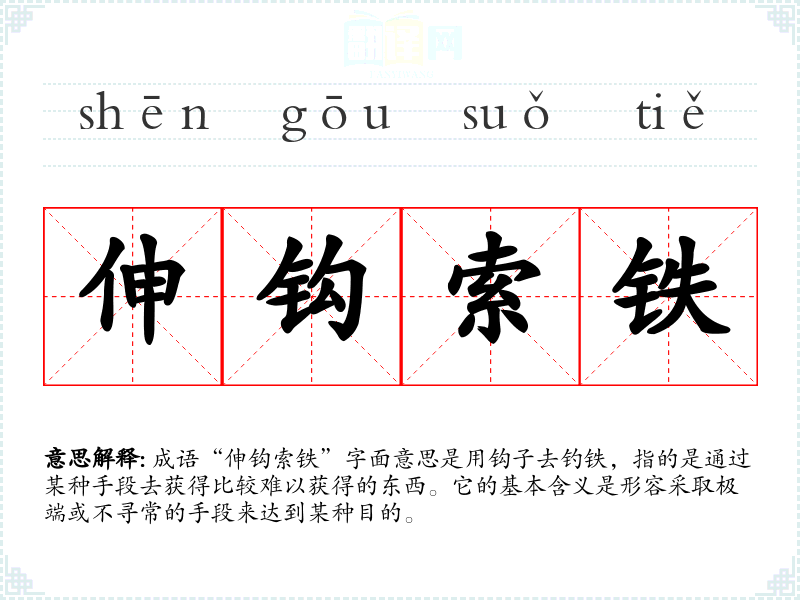 成语“伸钩索铁”字面意思是用钩子去钓铁,指的是通过某种手段去获得比较难以获得的东西。它的基本含义是形容采取极端或不寻常的手段来达到某种目的。
