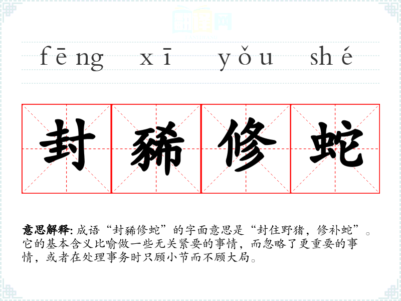 成语“封豨修蛇”的字面意思是“封住野猪,修补蛇”。它的基本含义比喻做一些无关紧要的事情,而忽略了更重要的事情,或者在处理事务时只顾小节而不顾大局。