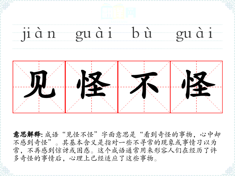 - “见怪不惊”:与“见怪不怪”相似,强调不因奇怪的事而感到惊讶。