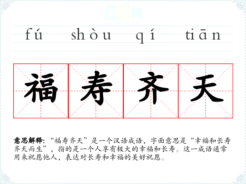 “福寿齐天”是一个汉语成语,字面意思是“幸福和长寿齐天而生”,指的是一个人享有极大的幸福和长寿。这一成语通常用来祝愿他人,表达对长寿和幸福的美好祝愿。