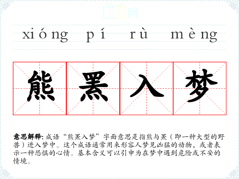 成语“熊罴入梦”字面意思是指熊与罴(即一种大型的野兽)进入梦中。这个成语通常用来形容人梦见凶猛的动物,或者表示一种恐惧的心情。基本含义可以引申为在梦中遇到危险或不安的情境。