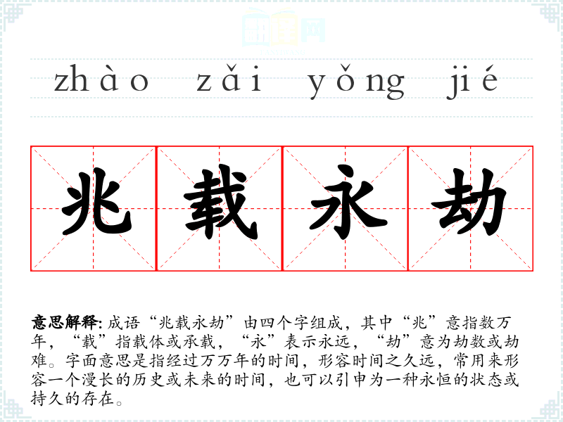 成语“兆载永劫”由四个字组成,其中“兆”意指数万年,“载”指载体或承载,“永”表示永远,“劫”意为劫数或劫难。字面意思是指经过万万年的时间,形容时间之久远,常用来形容一个漫长的历史或未来的时间,也可以引申为一种永恒的状态或持久的存在。