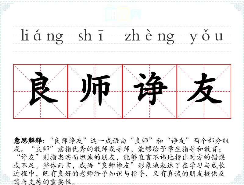 | 良师诤友 | 良:好;诤:敢于直言。很好的老师,能够直言相劝的朋友。 |