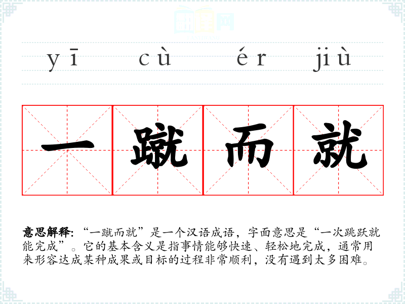 “一蹴而就”是一个汉语成语,字面意思是“一次跳跃就能完成”。它的基本含义是指事情能够快速、轻松地完成,通常用来形容达成某种成果或目标的过程非常顺利,没有遇到太多困难。