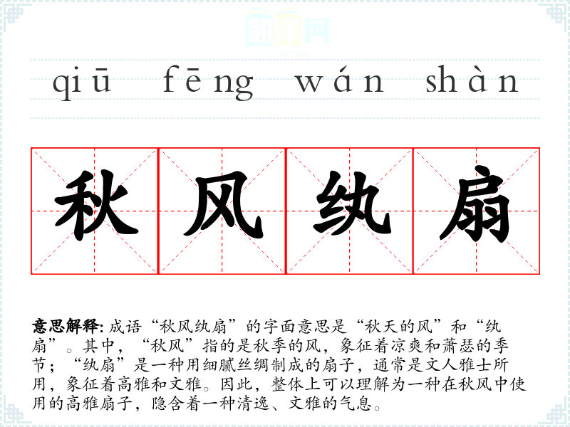 成语“秋风纨扇”的字面意思是“秋天的风”和“纨扇”。其中,“秋风”指的是秋季的风,象征着凉爽和萧瑟的季节;“纨扇”是一种用细腻丝绸制成的扇子,通常是文人雅士所用,象征着高雅和文雅。因此,整体上可以理解为一种在秋风中使用的高雅扇子,隐含着一种清逸、文雅的气息。