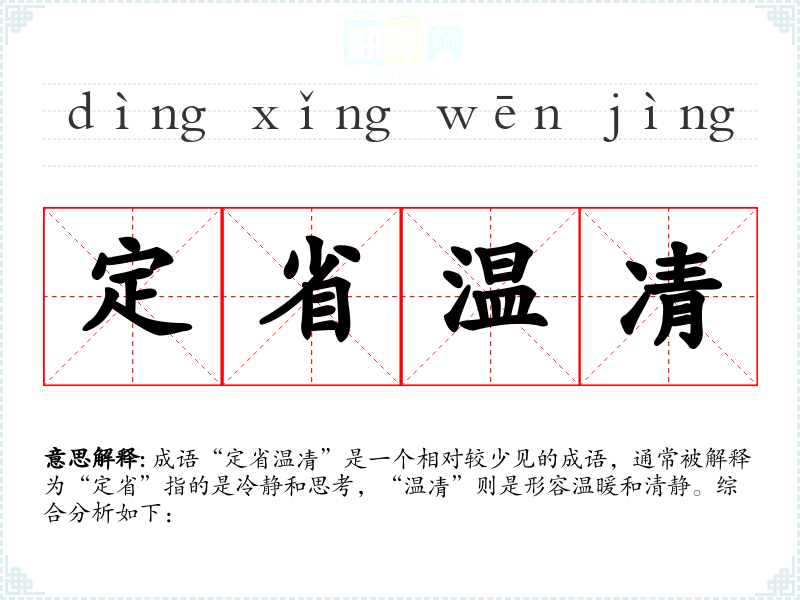 成语“定省温凊”是一个相对较少见的成语,通常被解释为“定省”指的是冷静和思考,“温凊”则是形容温暖和清静。综合分析如下: