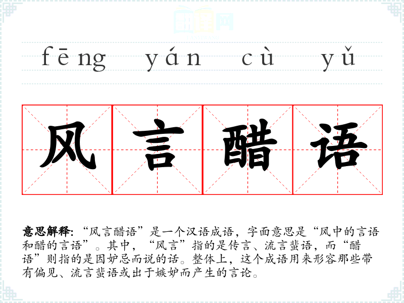 “风言醋语”是一个汉语成语,字面意思是“风中的言语和醋的言语”。其中,“风言”指的是传言、流言蜚语,而“醋语”则指的是因妒忌而说的话。整体上,这个成语用来形容那些带有偏见、流言蜚语或出于嫉妒而产生的言论。