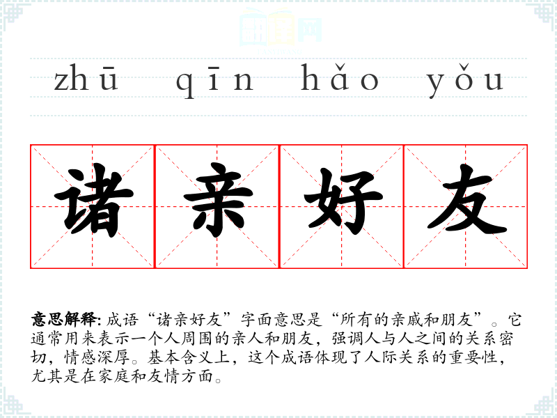 成语“诸亲好友”字面意思是“所有的亲戚和朋友”。它通常用来表示一个人周围的亲人和朋友,强调人与人之间的关系密切,情感深厚。基本含义上,这个成语体现了人际关系的重要性,尤其是在家庭和友情方面。