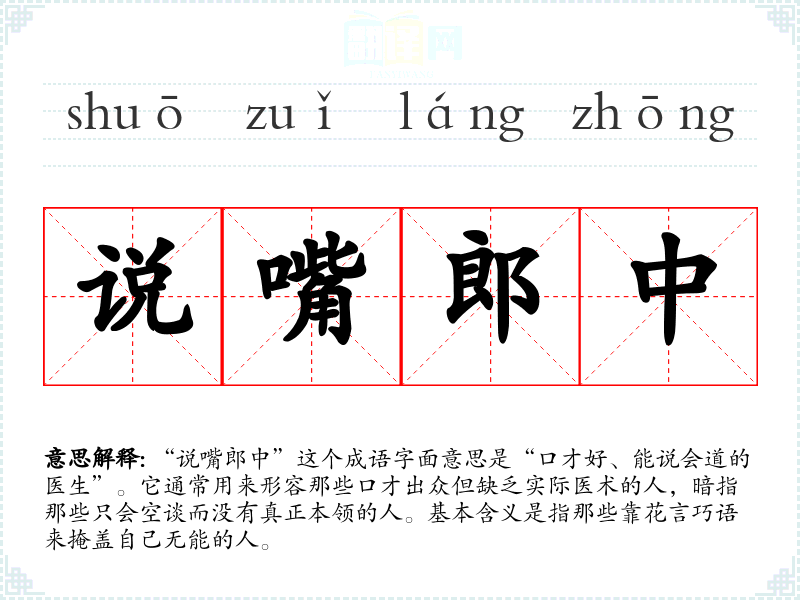 “说嘴郎中”这个成语字面意思是“口才好、能说会道的医生”。它通常用来形容那些口才出众但缺乏实际医术的人,暗指那些只会空谈而没有真正本领的人。基本含义是指那些靠花言巧语来掩盖自己无能的人。