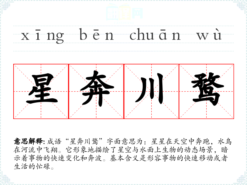 成语“星奔川鹜”字面意思为:星星在天空中奔跑,水鸟在河流中飞翔。它形象地描绘了星空与水面上生物的动态场景,暗示着事物的快速变化和奔波。基本含义是形容事物的快速移动或者生活的忙碌。