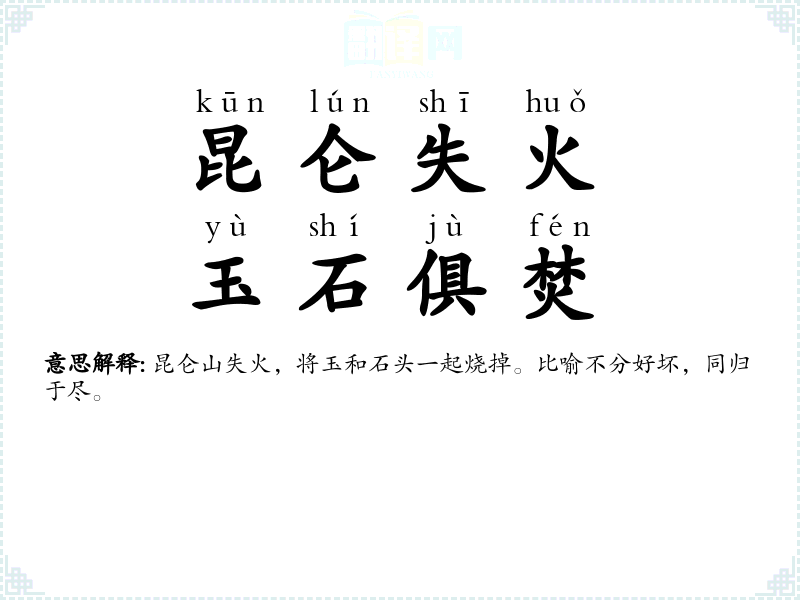 昆仑山失火,将玉和石头一起烧掉。比喻不分好坏,同归于尽。 |