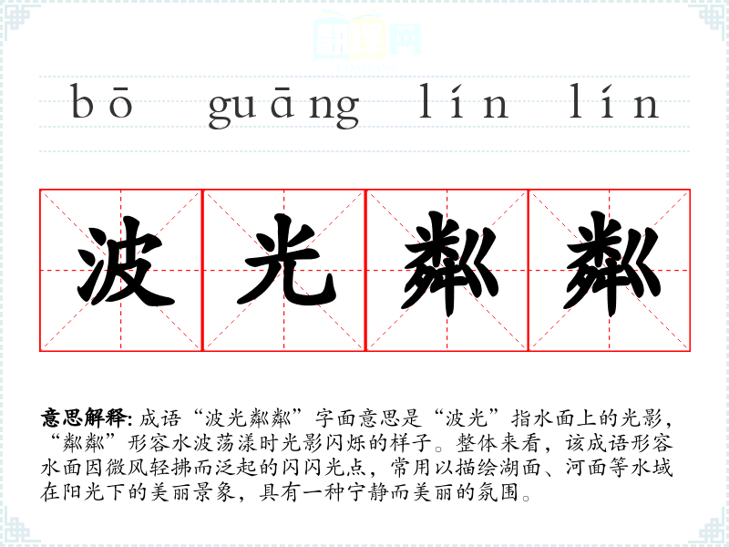 在**传统文化中,水象征着柔和、包容和生命,而“波光粼粼”则通过描绘自然之美,传递出一种和谐与宁静的感觉,反映了人们对自然的欣赏和向往。在现代社会,这种成语仍然适用于描述优美的自然景观,表达生活中的美好时刻。