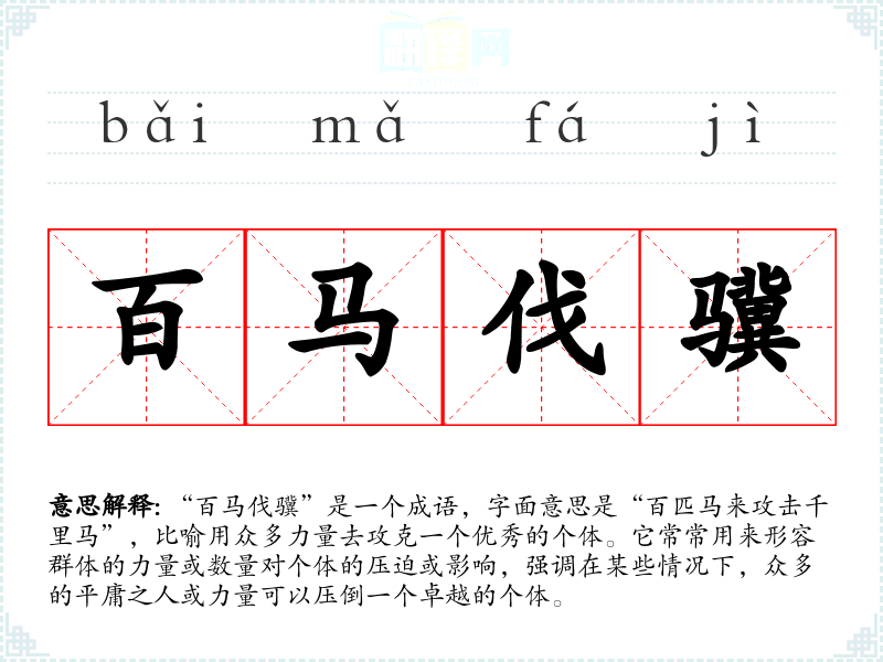 “百马伐骥”是一个成语,字面意思是“百匹马来攻击千里马”,比喻用众多力量去攻克一个优秀的个体。它常常用来形容群体的力量或数量对个体的压迫或影响,强调在某些情况下,众多的平庸之人或力量可以压倒一个卓越的个体。