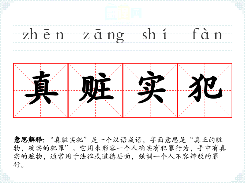 “真赃实犯”是一个汉语成语,字面意思是“真正的赃物,确实的犯罪”。它用来形容一个人确实有犯罪行为,手中有真实的赃物,通常用于法律或道德层面,强调一个人不容辩驳的罪行。