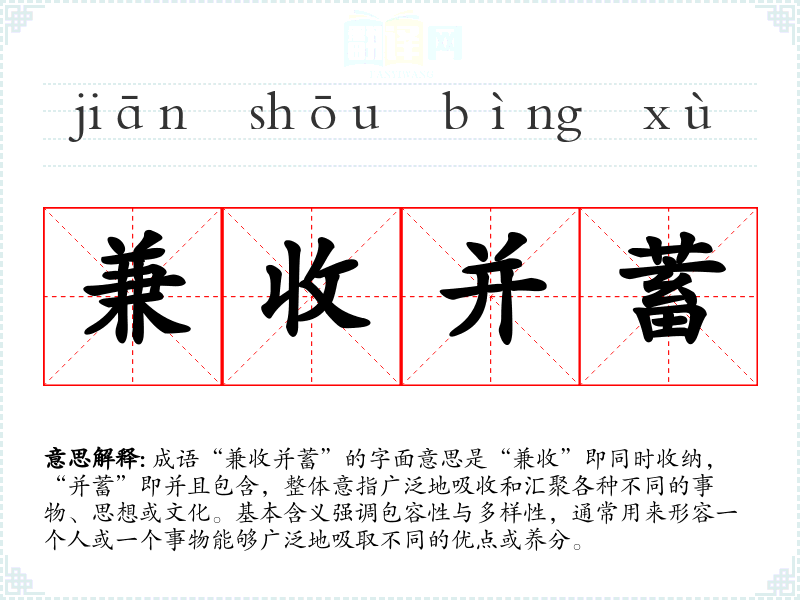 成语“兼收并蓄”的字面意思是“兼收”即同时收纳,“并蓄”即并且包含,整体意指广泛地吸收和汇聚各种不同的事物、思想或文化。基本含义强调包容性与多样性,通常用来形容一个人或一个事物能够广泛地吸取不同的优点或养分。