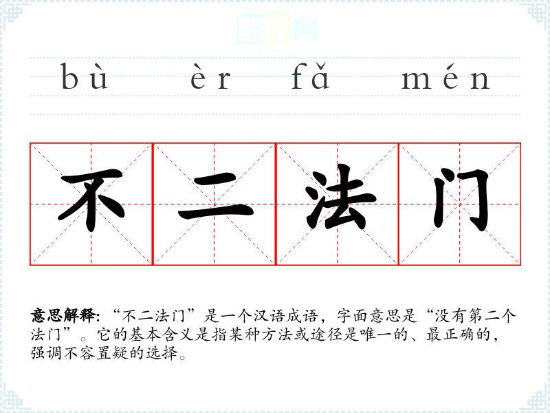 “不二法门”是一个汉语成语,字面意思是“没有第二个法门”。它的基本含义是指某种方法或途径是唯一的、最正确的,强调不容置疑的选择。