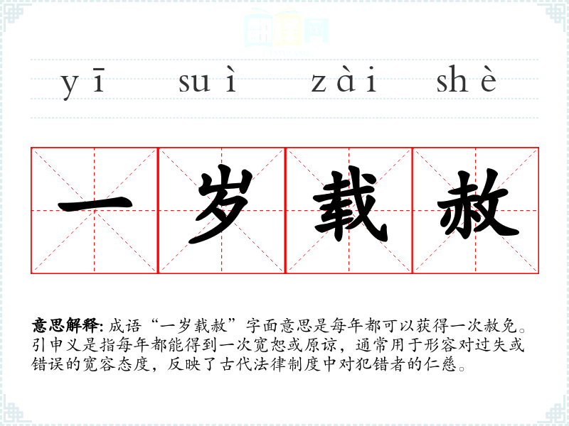 成语“一岁载赦”字面意思是每年都可以获得一次赦免。引申义是指每年都能得到一次宽恕或原谅,通常用于形容对过失或错误的宽容态度,反映了古代法律制度中对犯错者的仁慈。