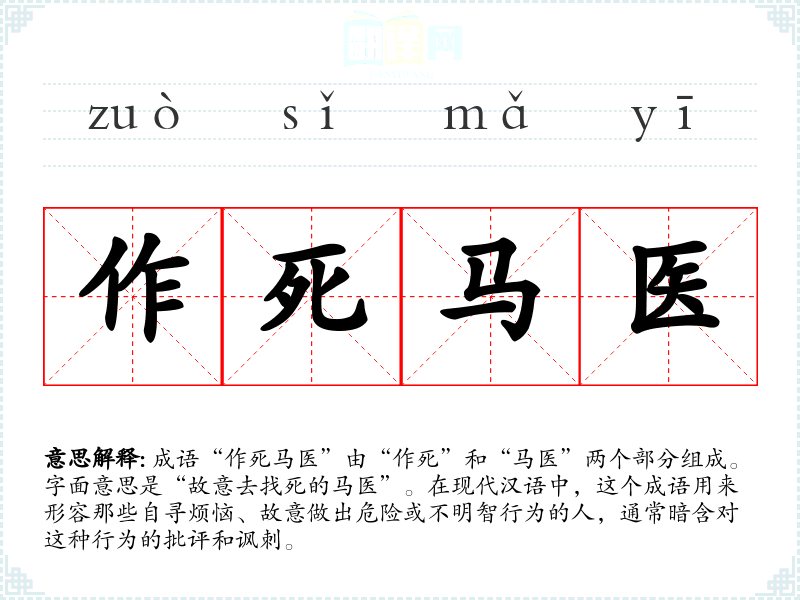 成语“作死马医”由“作死”和“马医”两个部分组成。字面意思是“故意去找死的马医”。在现代汉语中,这个成语用来形容那些自寻烦恼、故意做出危险或不明智行为的人,通常暗含对这种行为的批评和讽刺。