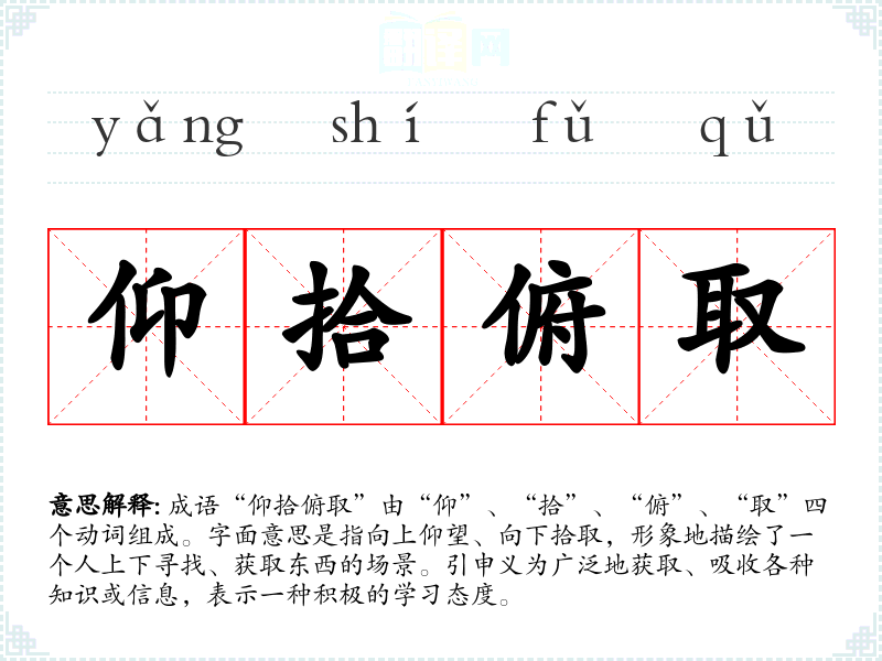 成语“仰拾俯取”由“仰”、“拾”、“俯”、“取”四个动词组成。字面意思是指向上仰望、向下拾取,形象地描绘了一个人上下寻找、获取东西的场景。引申义为广泛地获取、吸收各种知识或信息,表示一种积极的学*态度。
