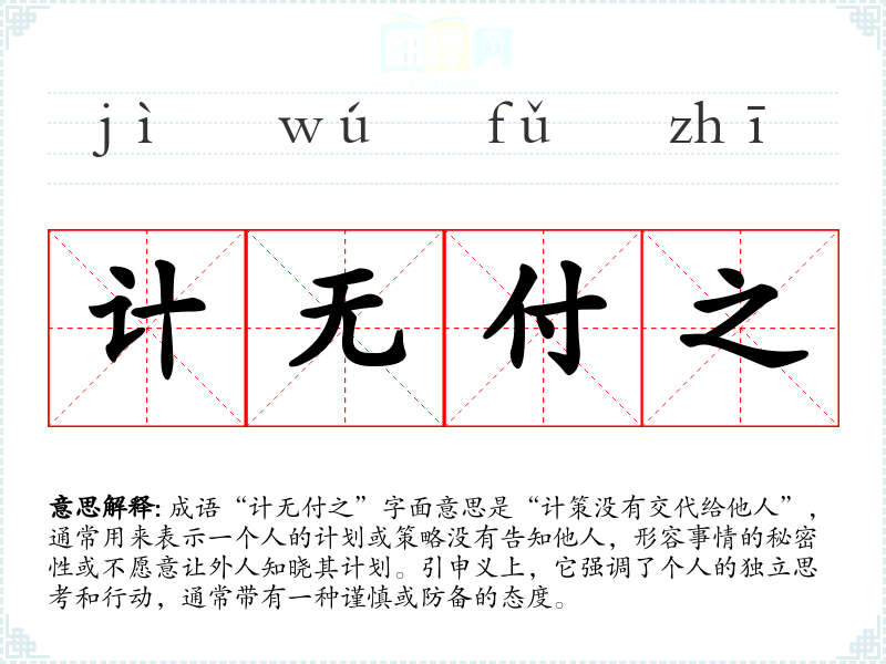 成语“计无付之”字面意思是“计策没有交代给他人”,通常用来表示一个人的计划或策略没有告知他人,形容事情的秘密性或不愿意让外人知晓其计划。引申义上,它强调了个人的独立思考和行动,通常带有一种谨慎或防备的态度。