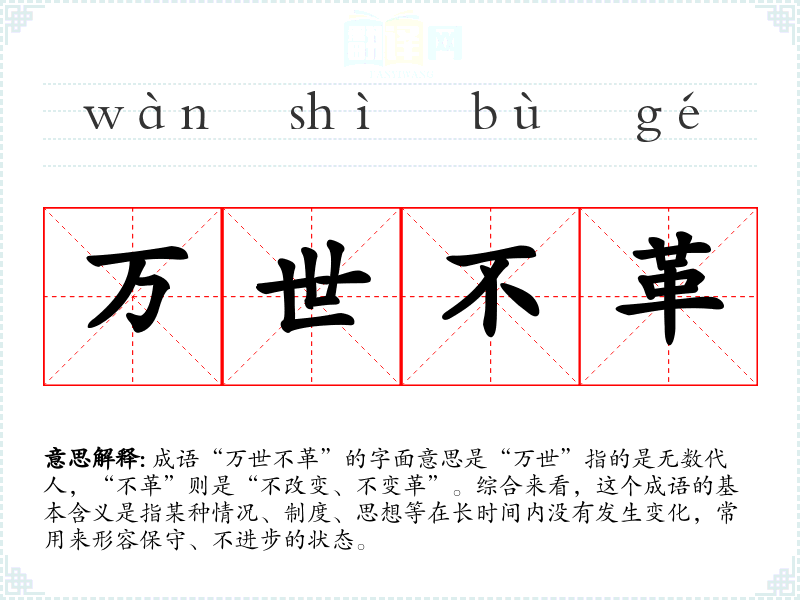 成语“万世不革”的字面意思是“万世”指的是无数代人,“不革”则是“不改变、不变革”。综合来看,这个成语的基本含义是指某种情况、制度、思想等在长时间内没有发生变化,常用来形容保守、不进步的状态。