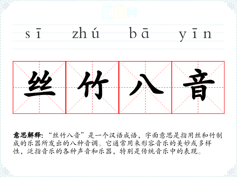 “丝竹八音”是一个汉语成语,字面意思是指用丝和竹制成的乐器所发出的八种音调。它通常用来形容音乐的美妙或多样性,泛指音乐的各种声音和乐器,特别是传统音乐中的表现。