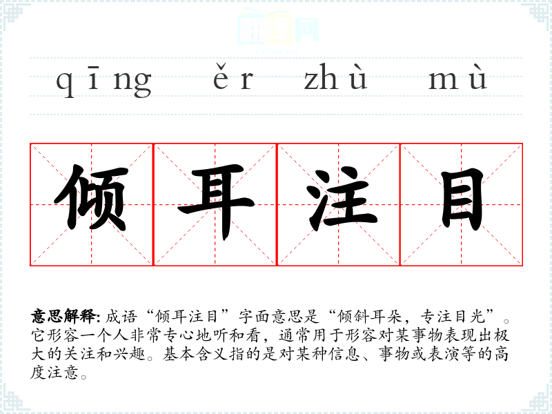 成语“倾耳注目”字面意思是“倾斜耳朵,专注目光”。它形容一个人非常专心地听和看,通常用于形容对某事物表现出极大的关注和兴趣。基本含义指的是对某种信息、事物或表演等的高度注意。