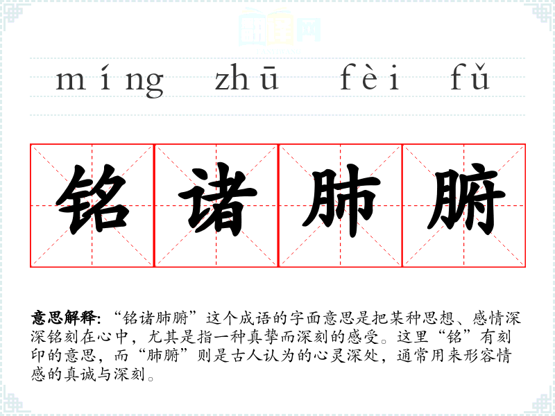 “铭诸肺腑”这个成语的字面意思是把某种思想、感情深深铭刻在心中,尤其是指一种真挚而深刻的感受。这里“铭”有刻印的意思,而“肺腑”则是古人认为的心灵深处,通常用来形容情感的真诚与深刻。