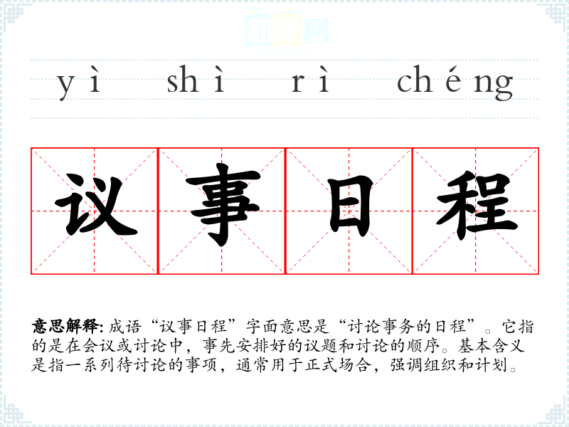 成语“议事日程”字面意思是“讨论事务的日程”。它指的是在会议或讨论中,事先安排好的议题和讨论的顺序。基本含义是指一系列待讨论的事项,通常用于正式场合,强调组织和计划。