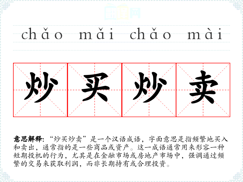 “炒买炒卖”是一个汉语成语,字面意思是指频繁地买入和卖出,通常指的是一些商品或资产。这一成语通常用来形容一种短期投机的行为,尤其是在金融市场或房地产市场中,强调通过频繁的交易来获取利润,而非长期持有或合理投资。