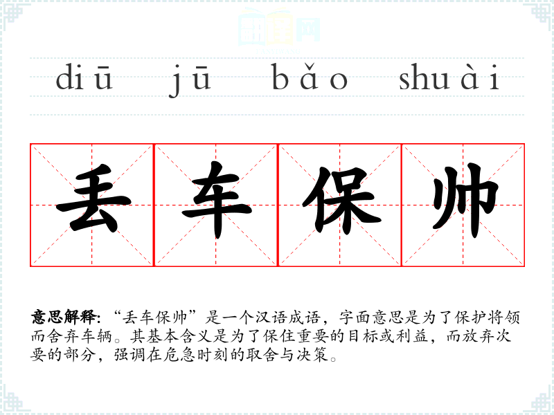 “丢车保帅”是一个汉语成语,字面意思是为了保护将领而舍弃车辆。其基本含义是为了保住重要的目标或利益,而放弃次要的部分,强调在危急时刻的取舍与决策。