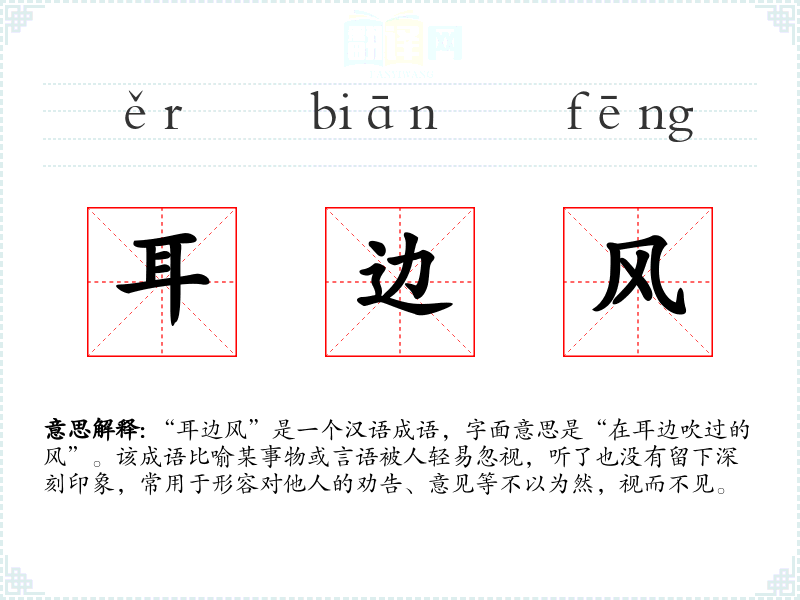 “耳边风”是一个汉语成语,字面意思是“在耳边吹过的风”。该成语比喻某事物或言语被人轻易忽视,听了也没有留下深刻印象,常用于形容对他人的劝告、意见等不以为然,视而不见。
